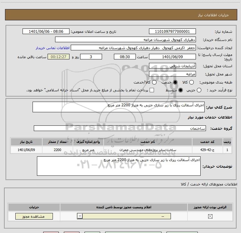 شرح کلی نیاز: اجرای آسفالت ریزی با زیر سازی جزیی به متراژ 2200 متر مربع