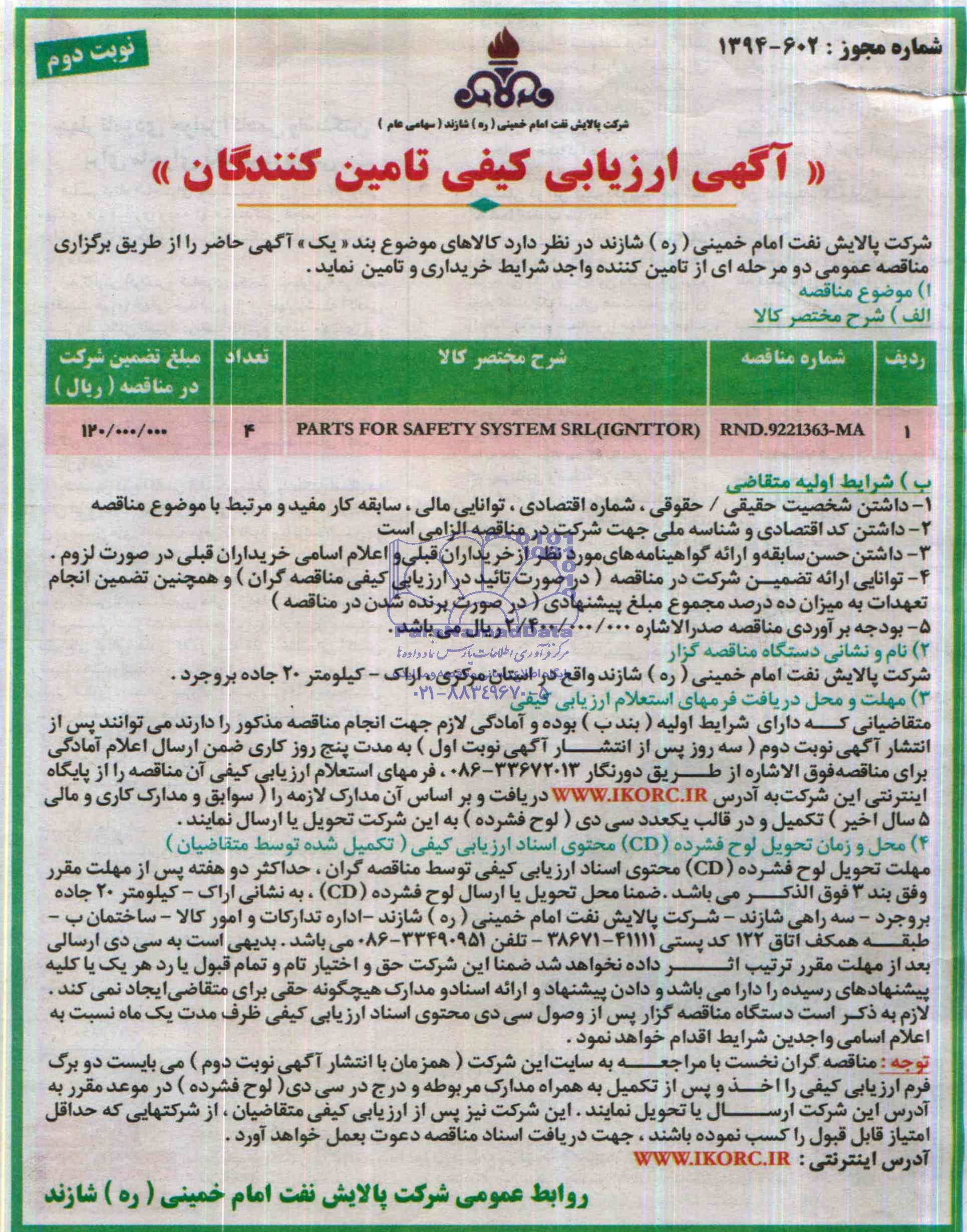 مناقصهPARTS FOR SAFETY SYSTEM SRL IGNTTOR, آگهی ارزیابی کیفی تامین کنندگان, مناقصهPARTS FOR SAFETY SYSTEM SRL IGNTTOR