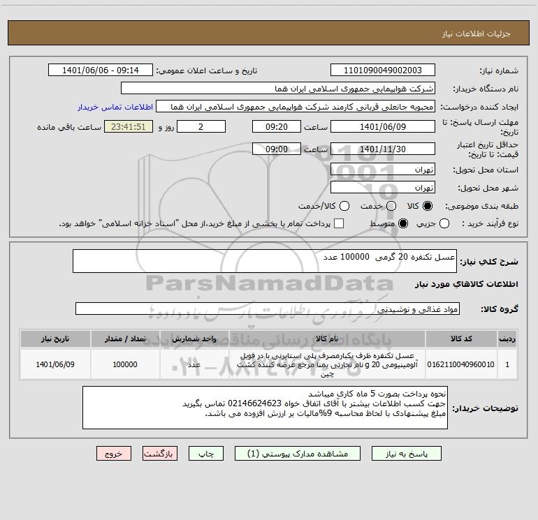 شرح کلی نیاز: عسل تکنفره 20 گرمی 100000 عدد