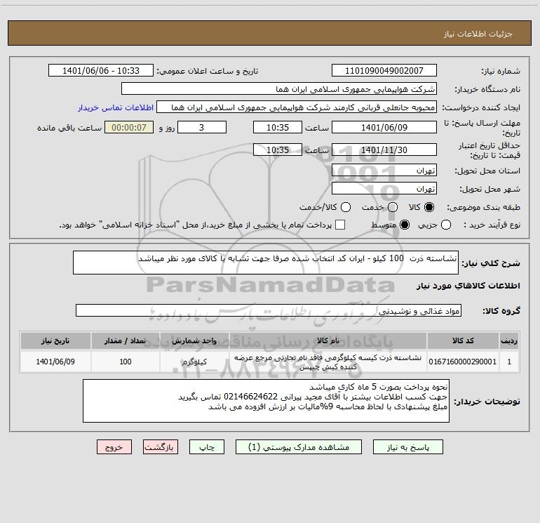 شرح کلی نیاز: نشاسته ذرت 100 کیلو - ایران کد انتخاب شده صرفا جهت تشابه با کالای مورد نظر میباشد