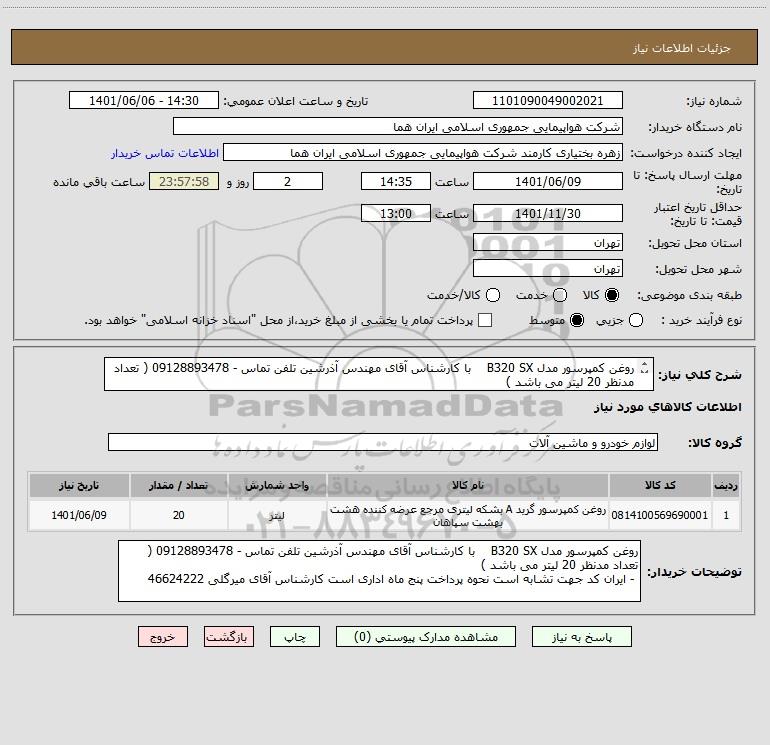 شرح کلی نیاز: روغن کمپرسور مدل B320 SX با کارشناس آقای مهندس آذرشین تلفن تماس - 09128893478 ( تعداد مدنظر 20 لیتر می باشد )