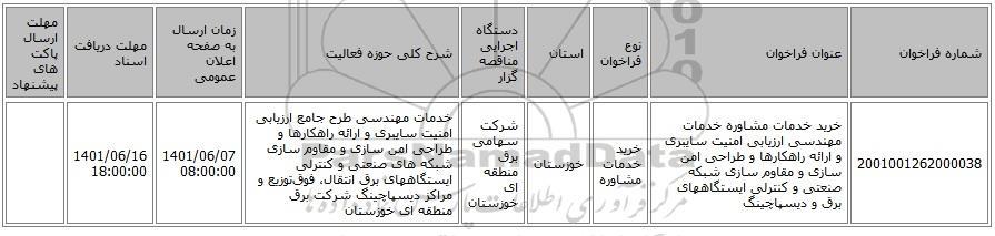 | 2001001262000038 | خرید خدمات مشاوره خدمات مهندسی ارزیابی امنیت سایبری و ارائه راهکارها و طراحی امن سازی و مقاوم سازی شبکه صنعتی و کنترلی ایستگاههای برق و دیسپاچینگ | خرید خدمات مشاوره | خوزستان | شرکت سهامی برق منطقه ای خوزستان | خدمات مهندسی طرح جامع ارزیابی امنیت سایبری و ارائه راهکارها و طراحی امن سازی و مقاوم سازی شبکه های صنعتی و کنترلی ایستگاههای برق انتقال، فوقتوزیع و مراکز دیسپاچینگ شرکت برق منطقه ای خوزستان | 1401/06/07 08:00:00 | 1401/06/16 18:00:00 |