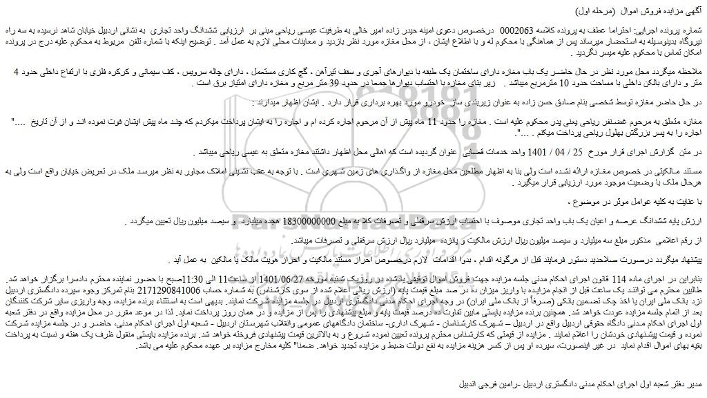 شماره پرونده اجرایی: احتراما عطف به پرونده کلاسه 0002063  درخصوص دعوی امینه حیدر زاده امیر خالی به طرفیت عیسی ریاحی مبنی بر  ارزیابی ششدانگ واحد تجاری  به نشانی اردبیل خیابان شاهد نرسیده به سه راه نیروگاه بدینوسیله به استحضار میرساند پس از هماهنگی با محکوم له و با اطلاع ایشان ، از محل مغازه مورد نظر بازدید و معاینات محلی لازم به عمل آمد . توضیح اینکه با شماره تلفن  مربوط به محکوم علیه درج در پرونده امکان تماس با محکوم علیه میسر نگردید .