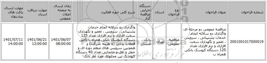 2001001017000019مناقصه عمومی دو مرحله ای واگذاری دو سالانه انجام خدمات پشتیبانی ، سرویس ، تعمیر و نگهداری سخت افزاری و نرم افزاری تعداد 125 دستگاه کیوسک بانکی همراه بمناقصه عمومیتهرانبانک مسکنواگذاری دو سالانه انجام خدمات پشتیبانی ، سرویس ، تعمیر و نگهداری سخت افزاری و نرم افزاری تعداد 125 دستگاه کیوسک بانکی همراه با تأمین قطعات یدکی (ه هزینه شرکت) و همچنین سرویس های منظم دوره ای و حمل و نقل و جابجایی تعداد 40 دستگاه کیوسک بین محلهای مورد نظر بانک 1401/06/07 08:00:001401/06/21 12:00:001401/07/11 14:00:00