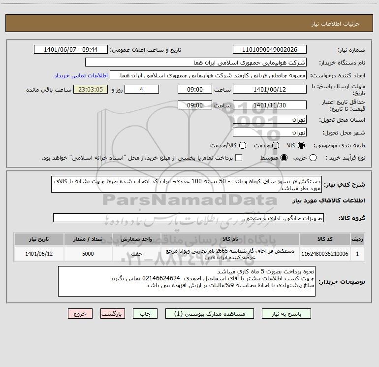 شرح کلی نیاز: دستکش فر نسوز ساق کوتاه و بلند - 50 بسته 100 عددی- ایران کد انتخاب شده صرفا جهت تشابه با کالای مورد نظر میباشد