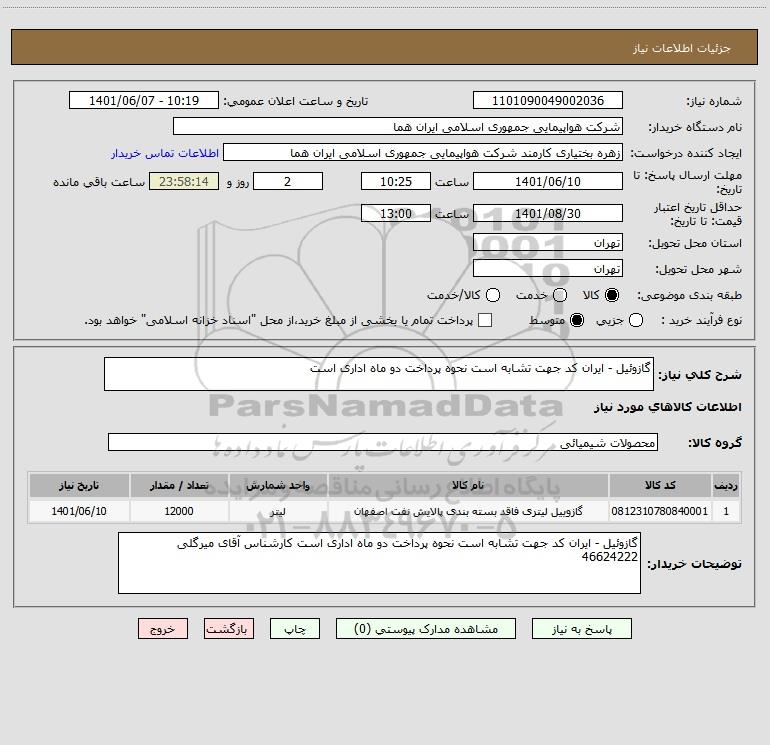شرح کلی نیاز: گازوئیل - ایران کد جهت تشابه است نحوه پرداخت دو ماه اداری است