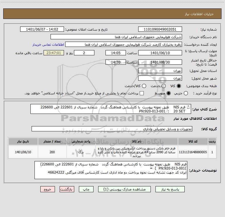 شرح کلی نیاز: فرم NIS طبق نمونه پیوست با کارشناس هماهنگ گردد شماره سریال از 222601 الی 226600 PN:920-013-001 : 20 SET