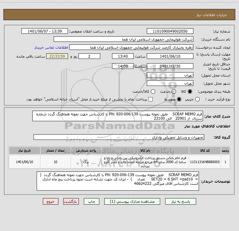 شرح کلی نیاز: فرم SCRAP MEMO طبق نمونه پیوست PN: 920-006-139 با کارشناس جهت نمونه هماهنگ گردد شماره سریال ار 22901 الی 23100