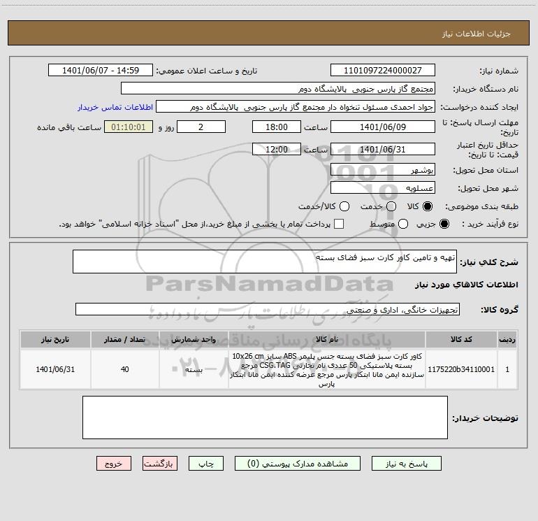 استعلام تهیه و تامین کاور کارت سبز فضای بسته, استعلام تهیه و تامین کاور کارت سبز فضای بسته