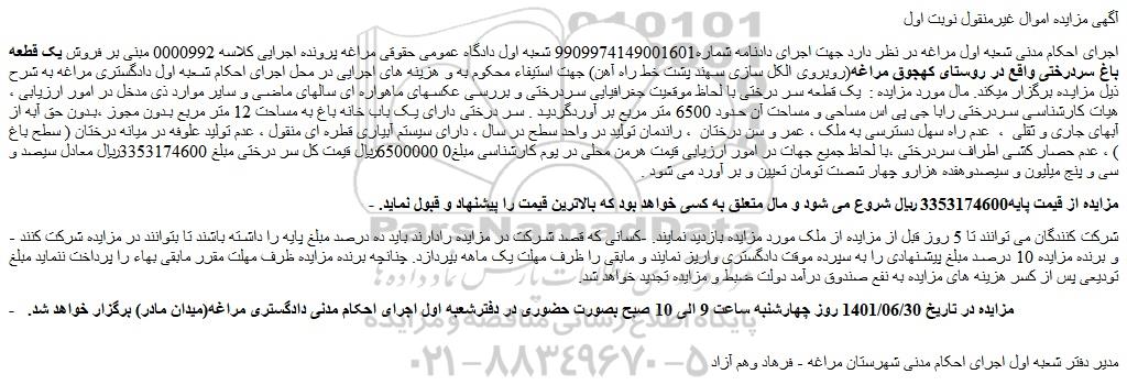 اجرای احکام مدنی شعبه اول مراغه در نظر دارد جهت اجرای دادنامه شماره9909974149001601 شعبه اول دادگاه عمومی حقوقی مراغه پرونده اجرایی کلاسه 0000992 مبنی بر فروش یک قطعه باغ سردرختی واقع در روستای کهجوق مراغه(روبروی الکل سازی سهند پشت خط راه آهن) جهت استیفاء محکوم به و هزینه های اجرایی در محل اجرای احکام شعبه اول دادگستری مراغه به شرح ذیل مزایده برگزار میکند. مال مورد مزایده : یک قطعه سر درختی با لحاظ موقعیت جغرافیایی سردرختی و بررسی عکسهای ماهواره ای سالهای ماضی و سایر موارد ذی مدخل در امور ارزیابی ، هیات کارشناسی سردرختی رابا جی پی اس مساحی و مساحت آن حدود 6500 متر مربع بر آوردگردید . سر درختی دارای یک باب خانه باغ به مساحت 12 متر مربع بدون مجوز ،بدون حق آبه از آبهای جاری و ثقلی ، عدم راه سهل دسترسی به ملک ، عمر و سن درختان ، راندمان تولید در واحد سطح در سال ، دارای سیستم آبیاری قطره ای منقول ، عدم تولید علوفه در میانه درختان ( سطح باغ ) ، عدم حصار کشی اطراف سردرختی ،با لحاظ جمیع جهات در امور ارزیابی قیمت هرمن محلی در یوم کارشناسی مبلغ0 6500000ریال قیمت کل سر درختی مبلغ 3353174600ریال معادل سیصد و سی و پنج میلیون و سیصدوهفده هزارو چهار شصت تومان تعیین و بر آورد می شود .