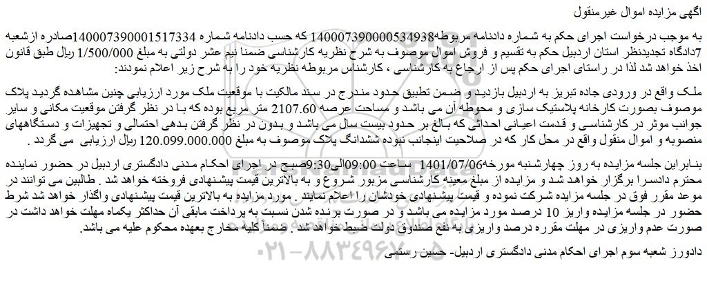 به موجب درخواست اجرای حکم به شماره دادنامه مربوطه140007390000534938 که حسب دادنامه شماره 140007390001517334صادره ازشعبه 7دادگاه تجدیدنظر استان اردبیل حکم به تقسیم و فروش اموال موصوف به شرح نظریه کارشناسی ضمنا نیم عشر دولتی به مبلغ 1/500/000 ریال طبق قانون اخذ خواهد شد لذا در راستای اجرای حکم پس از ارجاع به کارشناسی ، کارشناس مربوطه نظریه خود را به شرح زیر اعلام نمودند: