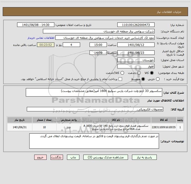 شرح کلی نیاز: سکسیونر 33 کیلو ولت شرکت پارس سوئیچ 1600 آمپر(مطابق مشخصات پیوست)
