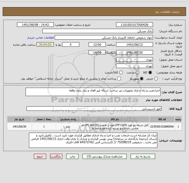 شرح کلی نیاز: اجرا،نصب و راه اندازی تجهیزات زیر ساخت شبکه غیر فعال و برق بدون وقفه
