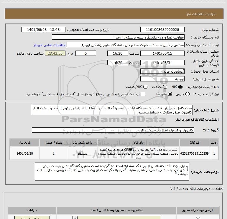 شرح کلی نیاز: ست کامل کامپیوتر به تعداد 5 دستگاه.تبلت سامسونگ 8 عدد.پد امضاء الکترونیکی وکوم 1 عدد و سخت افزار کامپیوتر طبق مدارک و شرایط پیوستی