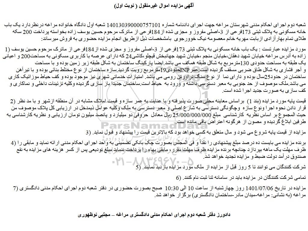 مزایده فروش  یک باب خانه مسکونی به پلاک ثبتی 173فرعی از 3-اصلی مفروز و مجزی شده از184فرعی