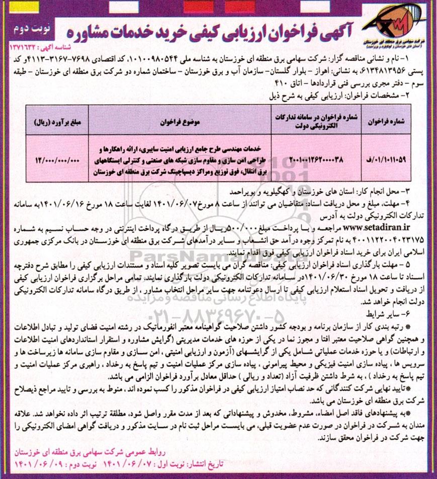 | 01/1011059/ ف | 2001001262000038 | خدمات مهندسی طرح جامع ارزیابی امنیت سایبری ارائه راهکارها و طراحی امن سازی و مقاوم سازی شبکه های صنعتی و کنترلی ایستگاه های برق انتقال، فوق توزیع و مراکز دیسپاچینگ شرکت برق منطقه ای خوزستان | 12.000.000.000 |