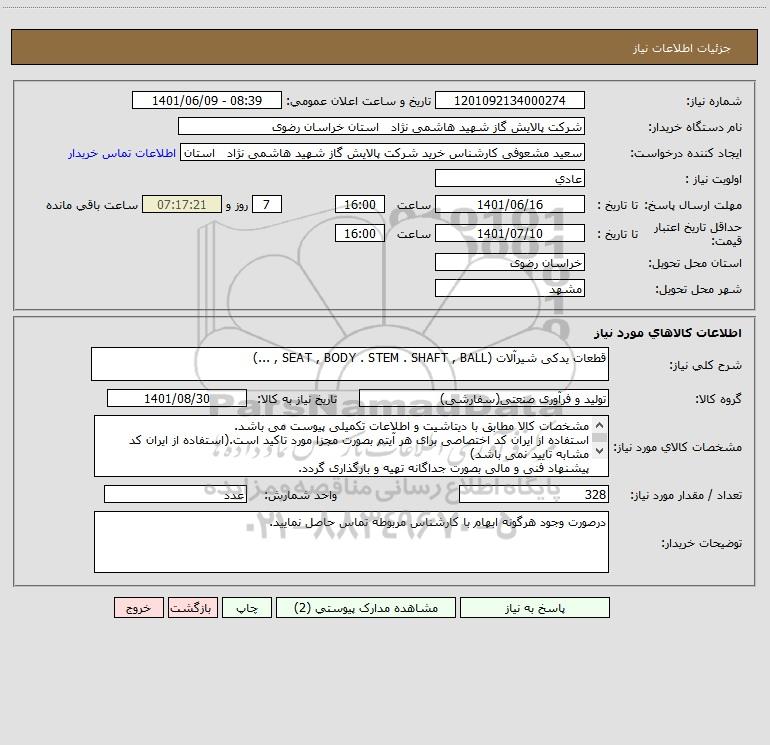 نام دستگاه خریدار:شرکت پالایش گاز شهید هاشمی نژاد استان خراسان رضوی