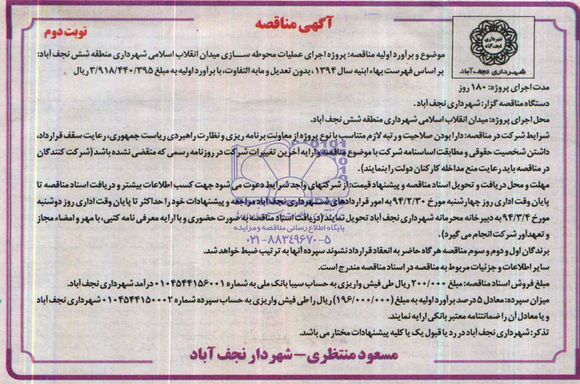 موضوع و برآورد اولیه مناقصه: پروژه اجرای عملیات محوطه سازی میدان انقلاب اسلامی شهرداری منطقه شش نجف آباد، بر اساس فهرست بهاء ابنیه سال 1394، بدون تعدیل و مابه التفاوت، با برآورد اولیه به مبلغ 3.918.440.395 ریال