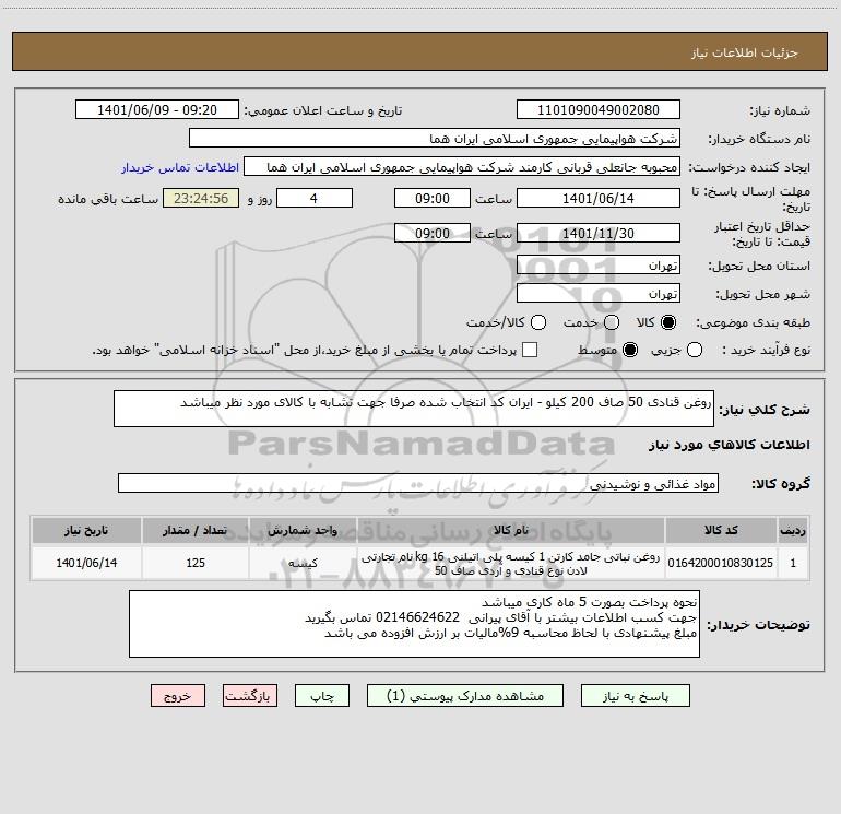 شرح کلی نیاز: روغن قنادی 50 صاف 200 کیلو - ایران کد انتخاب شده صرفا جهت تشابه با کالای مورد نظر میباشد