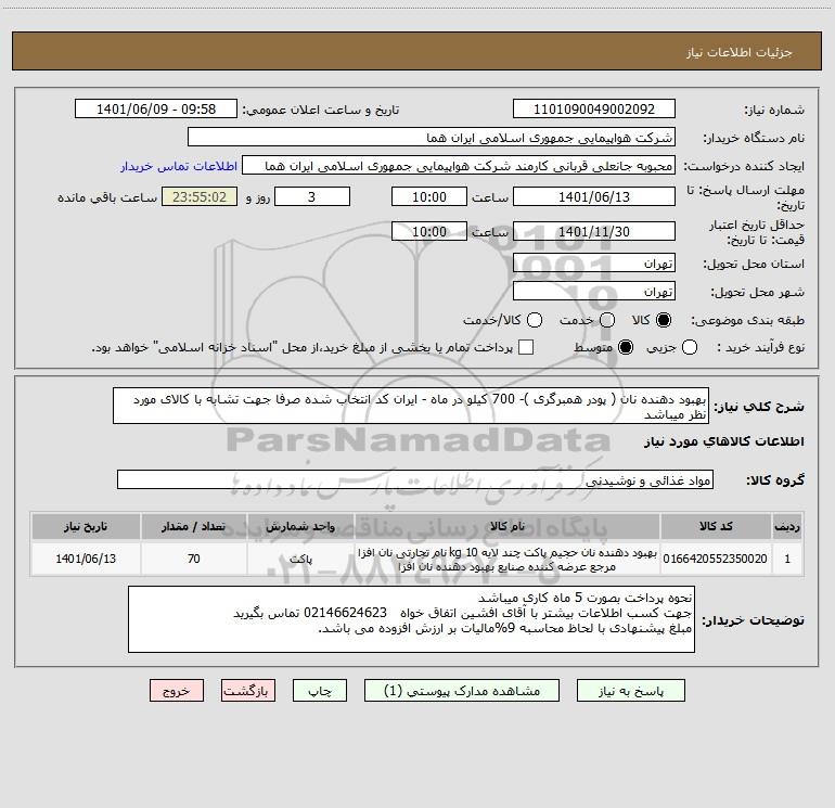 شرح کلی نیاز: بهبود دهنده نان ( پودر همبرگری )- 700 کیلو در ماه - ایران کد انتخاب شده صرفا جهت تشابه با کالای مورد نظر میباشد