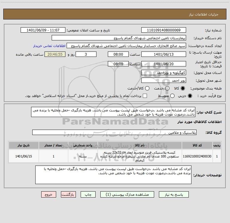 نام دستگاه خریدار:بیمارستان تامین اجتماعی شهدای گمنام یاسوج