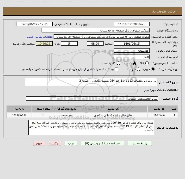 شرح کلی نیاز: نی بری زیر دکلهای 113 و114 خط 934 شهید دقایقی - امیدیه 2