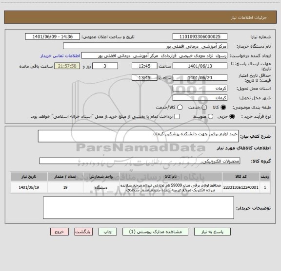 شرح کلی نیاز: خرید لوازم برقی جهت دانشکده پزشکی کرمان