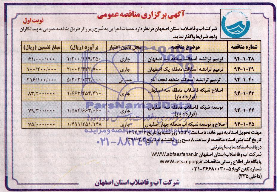 شرکت آب و فاضلاب استان اصفهان در نظر دارد عملیات اجرایی به شرح زیر را از طریق مناقصه عمومی به پیمانکاران واجد شرایط واگذار نماید: