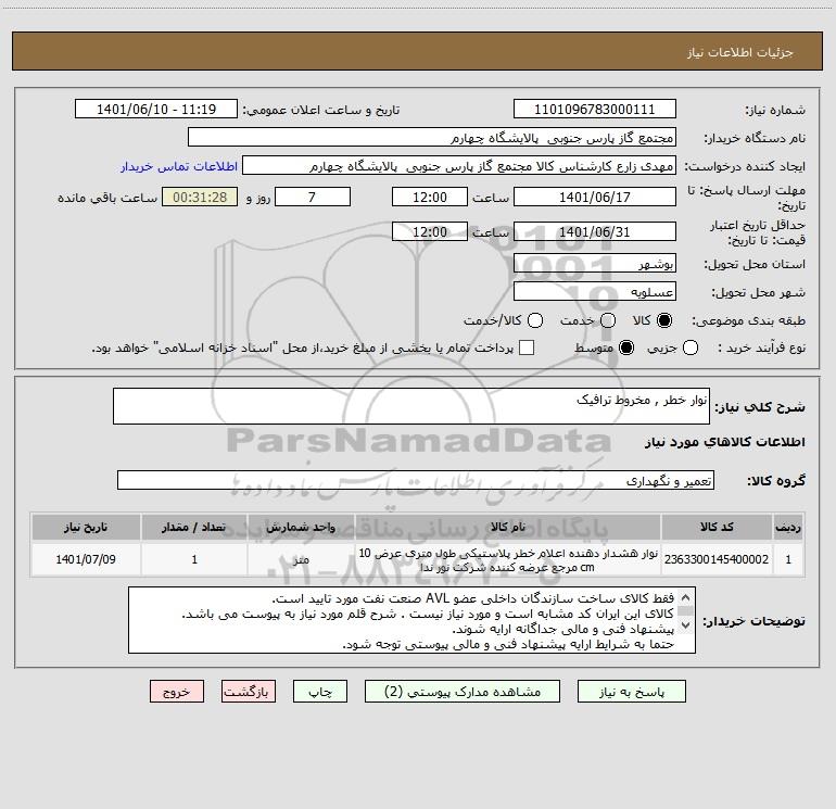 | 1 | 2363300145400002 | نوار هشدار دهنده اعلام خطر پلاستیکی طول متری عرض 10 cm مرجع عرضه کننده شرکت نور ندا | متر | 1 | 1401/07/09 |