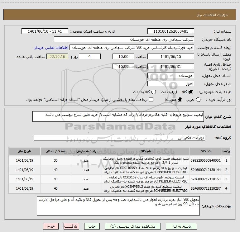 استعلام لیمیت سوئیچ مربوط به کلیه مکانیزم فرمان//ایران کد مشابه است// خرید طبق شرح پیوست می باشد, استعلام لیمیت سوئیچ مربوط به کلیه مکانیزم فرمان//ایران کد مشابه است// خرید طبق شرح پیوست می باشد