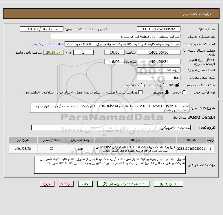 شرح کلی نیاز: Fuse 36kv AC/6.3A TP360V 6.3A 325M1 P/N:J1005269 / ایران کد مشابه است / خرید طبق شرح پیوست می باشد