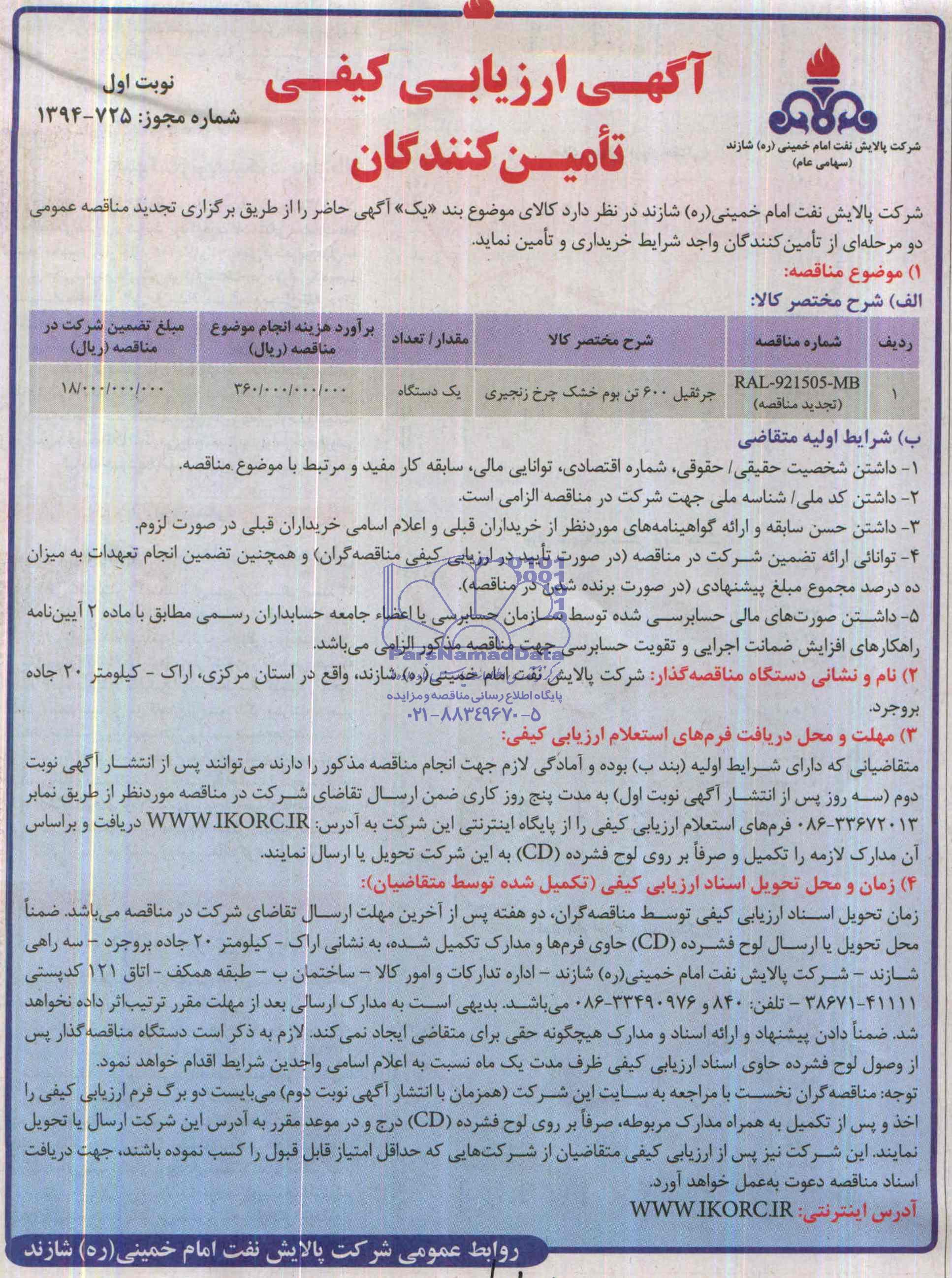 شرکت پالایش نفت امام خمینی ره شازند در نظر دارد کالای موضوع بند یک آگهی حاضر را از طریق برگزاری مناقصه عمومی دو مرحله ای ازتامین کننده واجد شرایط خریداری و تامین نماید.