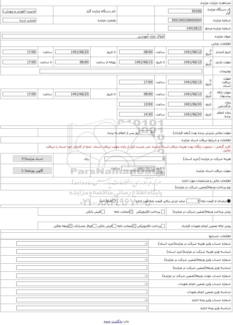| عنوان مزایده | املاک مازاد آموزشی | |||