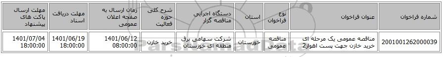 مناقصه، مناقصه عمومی یک مرحله ای خرید خازن جهت پست اهواز2 از کلیه افراد متخصص و شرکتها واجد شرایط دعوت به عمل میآید در مناقصه با کد خبرگزاری پارس نماد: 4893002 شرکت نمایند.