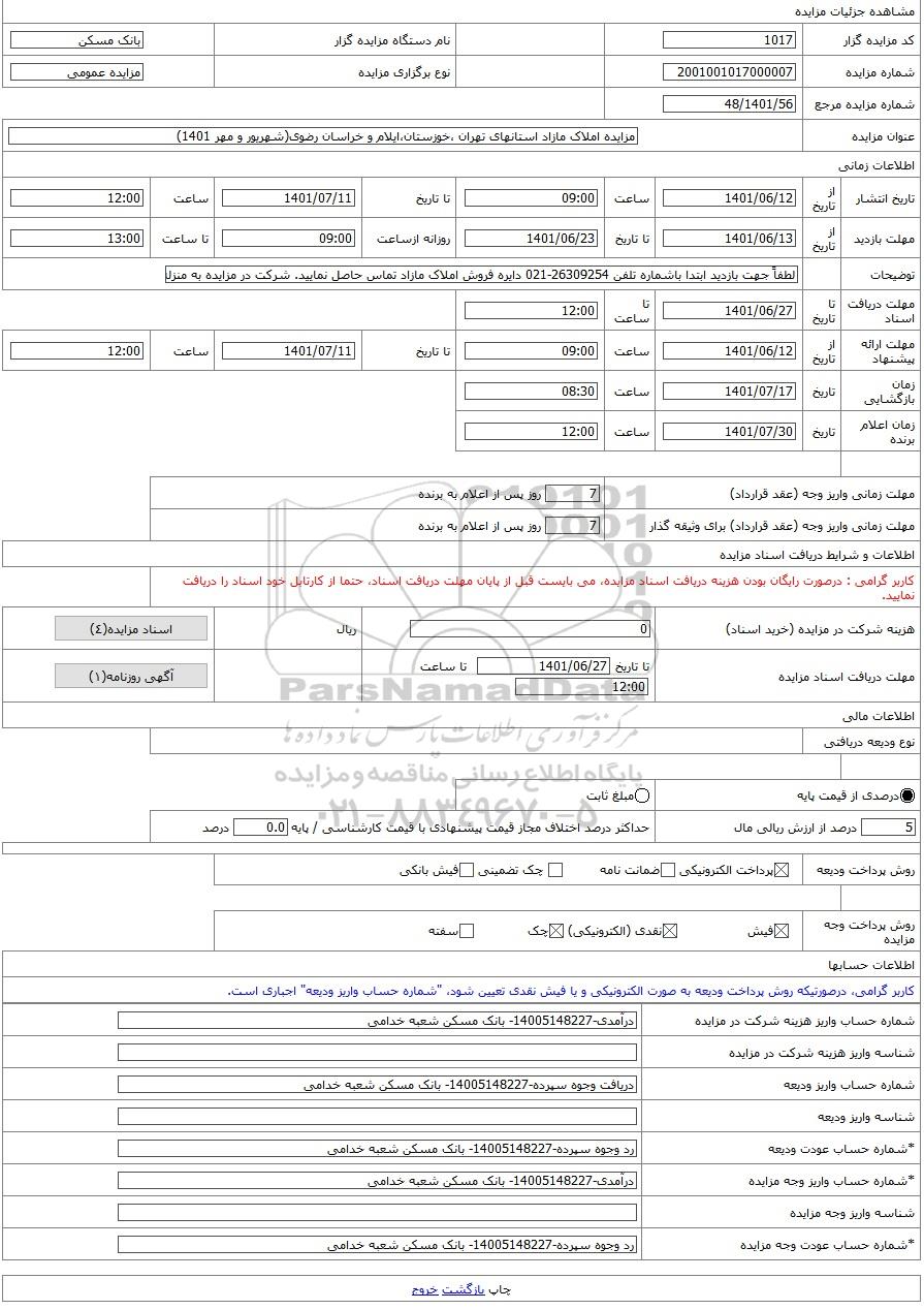 شماره حساب واریز وجه مزایده | درآمدی-14005148227- بانک مسکن شعبه خدامی |