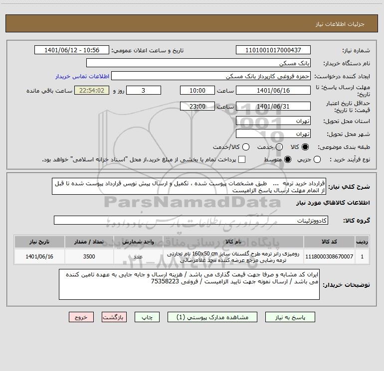 شرح کلی نیاز: قرارداد خرید ترمه ... طبق مشخصات پیوست شده ، تکمیل و ارسال پیش نویس قرارداد پیوست شده تا قبل از اتمام مهلت ارسال پاسخ الزامیست