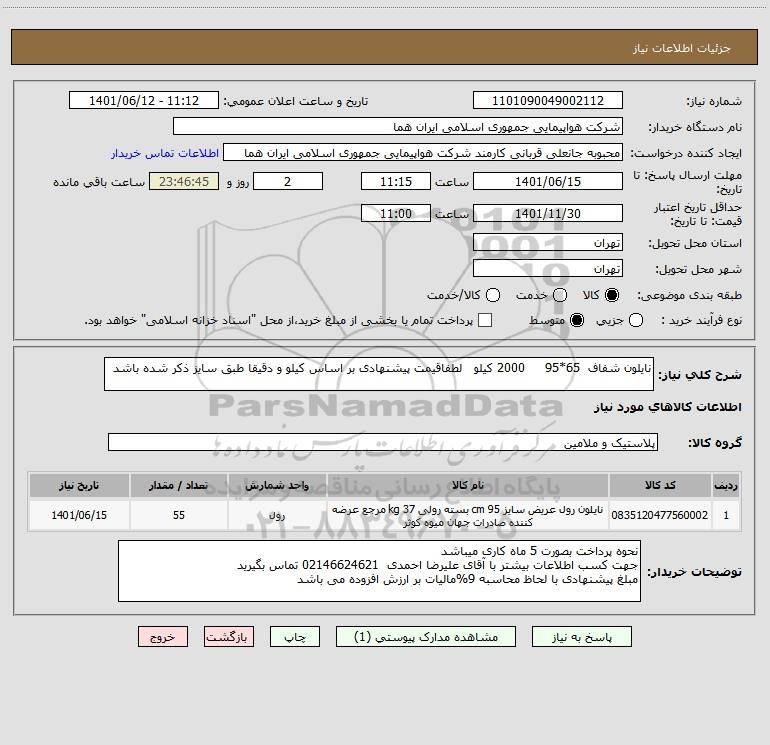 شرح کلی نیاز: نایلون شفاف 65*95 2000 کیلو لطفاقیمت پیشنهادی بر اساس کیلو و دقیقا طبق سایز ذکر شده باشد
