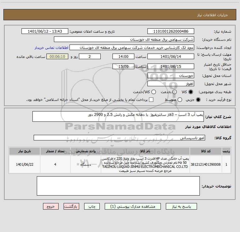 شرح کلی نیاز: پمپ آب 3 اسب – 3فاز سانتریفیوژ با دهانه مکش و رانش 2.5 و 2900 دور