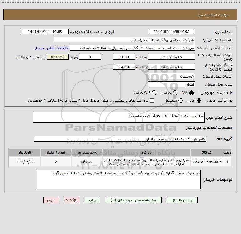 شرح کلی نیاز: انتقال برد کوتاه (مطابق مشخصات فنی پیوست)