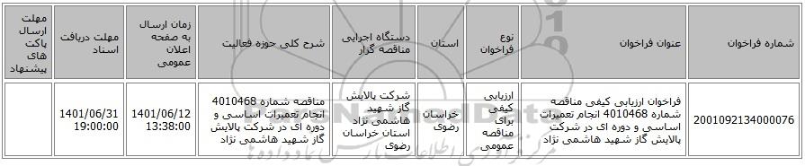 | 2001092134000076 | فراخوان ارزیابی کیفی مناقصه شماره 4010468 انجام تعمیرات اساسی و دوره ای در شرکت پالایش گاز شهید هاشمی نژاد | ارزیابی کیفی برای مناقصه عمومی | خراسان رضوی | شرکت پالایش گاز شهید هاشمی نژاد استان خراسان رضوی | مناقصه شماره 4010468 انجام تعمیرات اساسی و دوره ای در شرکت پالایش گاز شهید هاشمی نژاد | 1401/06/12 13:38:00 | 1401/06/31 19:00:00 |
