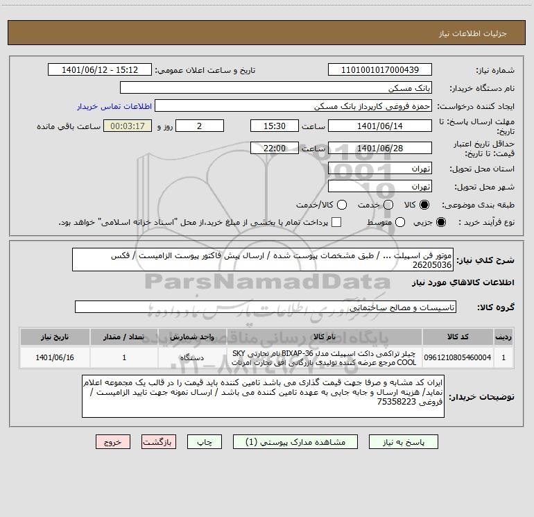 شرح کلی نیاز: موتور فن اسپیلت ... / طبق مشخصات پیوست شده / ارسال پیش فاکتور پیوست الزامیست / فکس 26205036