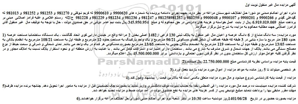 دایره اجرای احکام مدنی دو شورا حل اختلاف شهرستان مراغه در نظر دارد جهت اجرای دادنامه پرونده به شماره های 9900620 و 9900610 له کریم توکلی و 981270 و 981253 و 981252 و 981013 له محمدعلی محمدی و 9900266 و 9900201 و 9900107 و 9900048 و 981259 و 981258981257 و 981247 و 981236 و 981234 و 981229 و 981228 ج/2له رستم غلامی و علیه فرامز اصلانی مبنی بر پرداخت مبلغ 6.919.019.069 ریال از بابت اصل خواسته و هزینه های دادرسی در حق محکوم له و مبلغ 345.950.954 ریال بابت نیم عشر دولتی در حق صندوق دولت ، حال با توجه به توقیف مال غیر منقول آقای فرامرز اصلانی جهت مطالبه محکوم به مزایده به شرح ذیل برگزار میگردد.