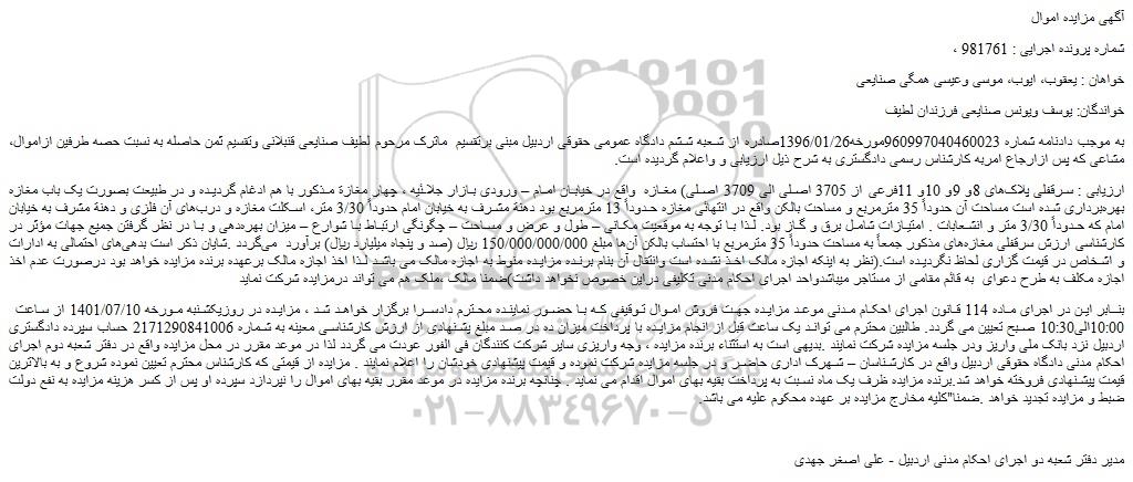 ،به موجب دادنامه شماره 960997040460023مورخه1396/01/26صادره از شعبه ششم دادگاه عمومی حقوقی اردبیل مبنی برتقسیم ماترک مرحوم لطیف صنایعی قنبلانی وتقسیم ثمن حاصله به نسبت حصه طرفین ازاموال مشاعی که پس ازارجاع امربه کارشناس رسمی دادگستری به شرح ذیل ارزیابی و واعلام گردیده است.