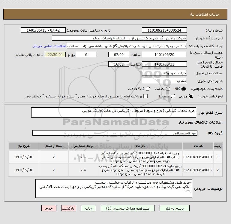 نام دستگاه خریدار:شرکت پالایش گاز شهید هاشمی نژاد استان خراسان رضوی
