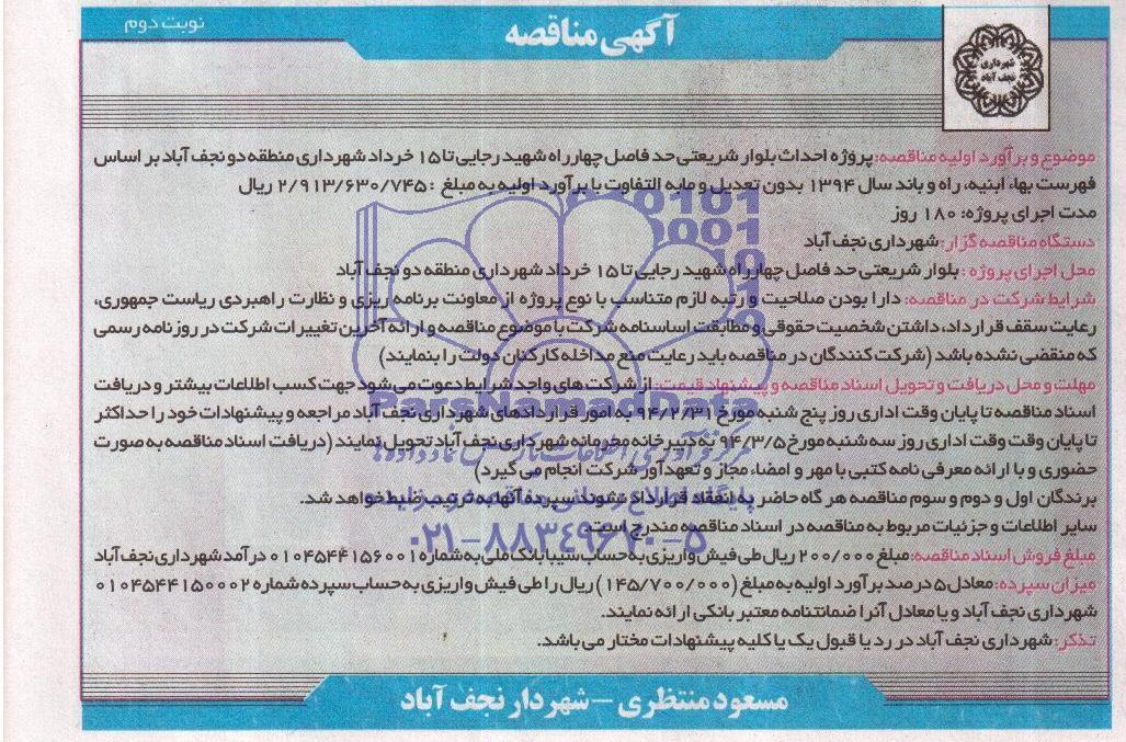 موضوع و برآورد اولیه مناقصه: پروژه احداث بلوار شریعتی حد فاصل چهارراه شهید رجایی تا 15 خرداد شهرداری منطقه دو نجف آباد بر اساس فهرست بها ابنیه راه و باند سال 94 بدون تعدیل و مابه التفاوت با برآورد اولیه به مبلغ 2.913.630.745 ریال