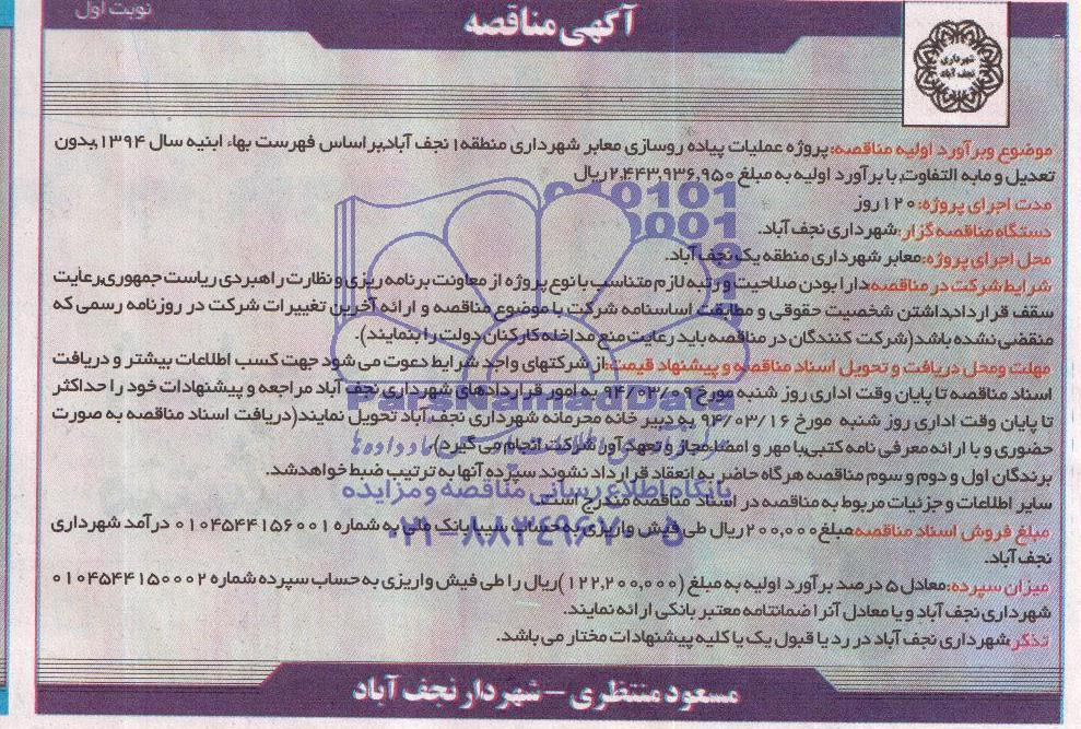 موضوع و برآورد اولیه مناقصه: پروژه عملیات پیاده روسازی معابر شهرداری منطقه 1 نجف آباد بر اساس فهرست بهاء ابنیه سال 1394 بدون تعدیل و مابه التفاوت با برآورد اولیه به مبلغ 2.443.936.950 ریال