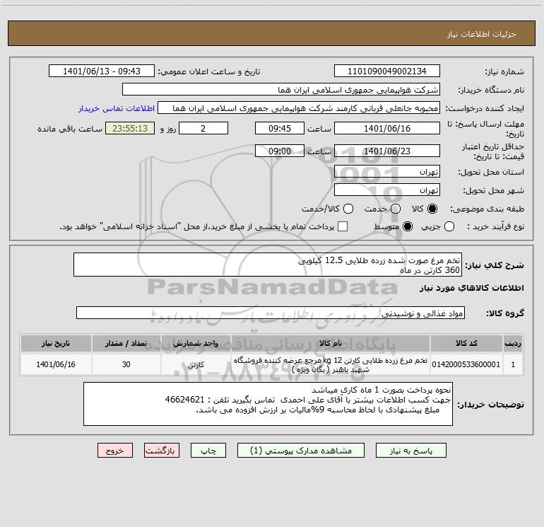 شرح کلی نیاز: تخم مرغ صورت شده زرده طلایی 12.5 کیلویی