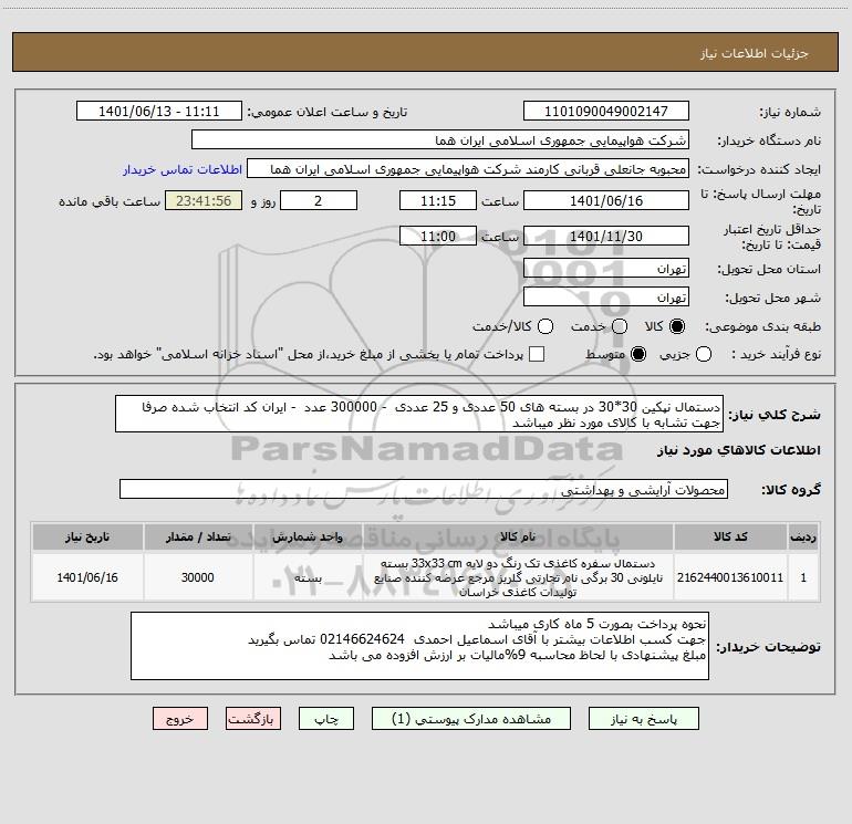 شرح کلی نیاز: دستمال نپکین 30*30 در بسته های 50 عددی و 25 عددی - 300000 عدد - ایران کد انتخاب شده صرفا جهت تشابه با کالای مورد نظر میباشد