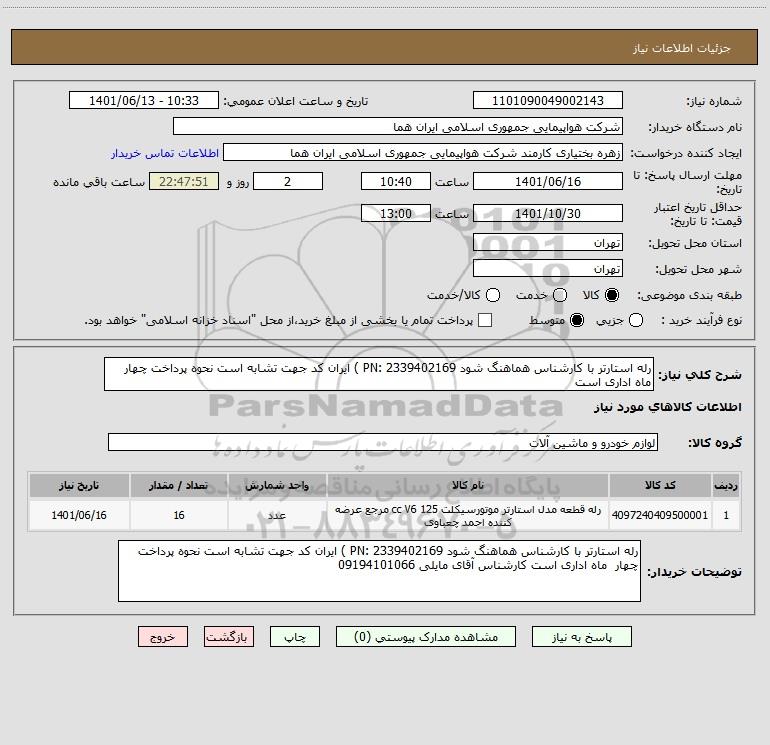 شرح کلی نیاز: رله استارتر با کارشناس هماهنگ شود 2339402169 :PN ) ایران کد جهت تشابه است نحوه پرداخت چهار ماه اداری است