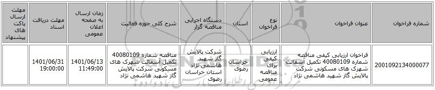 مناقصه، فراخوان ارزیابی کیفی مناقصه شماره 40080109 تکمیل آسفالت شهرک های مسکونی شرکت پالایش گاز شهید هاشمی نژاد, مناقصه، فراخوان ارزیابی کیفی مناقصه شماره 40080109 تکمیل آسفالت شهرک های مسکونی شرکت پالایش گاز شهید هاشمی نژاد